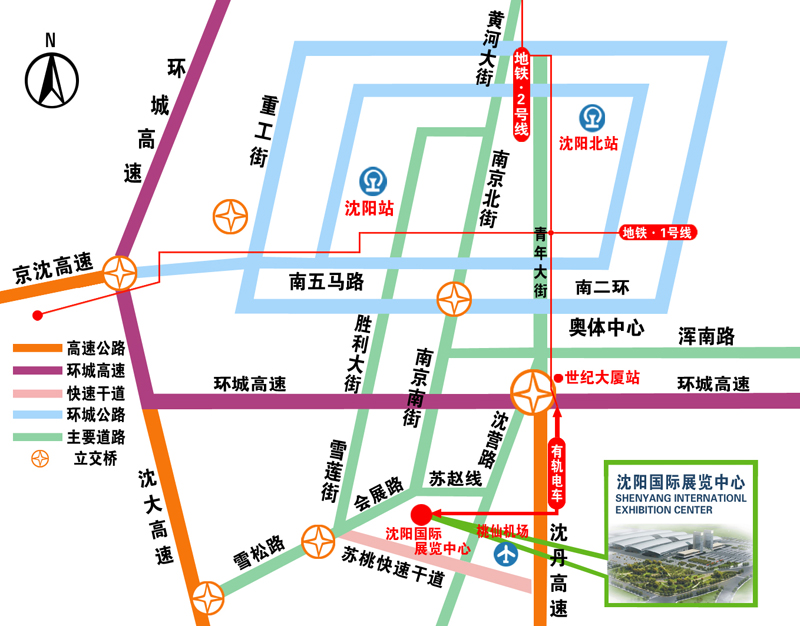 4、沈海高速(大連方向):沈海高速→沈陽(yáng)方向→蘇家屯出口→雪松路→會(huì)展路→沈陽(yáng)國(guó)際展覽中心